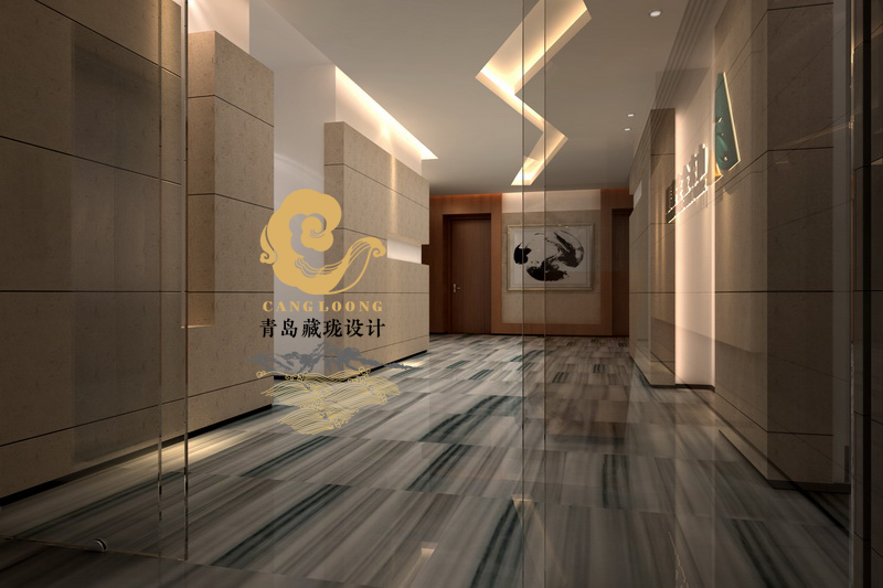 办公门厅前台设计,主要使用石材为装饰材料表达企业稳定坚固的历史和形象