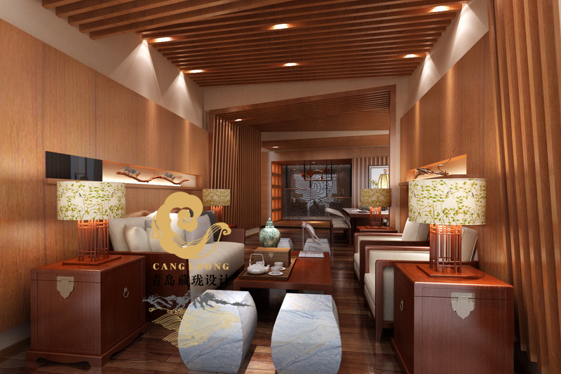 贵宾领导接待室,靠近董事长室旁边并和董事长房间做成套间使用,整体使用古色古香的中式风格体现厚重的历史文化,结合附近三生缘茶室的书香氛围并挂了两幅范增大师的书法。