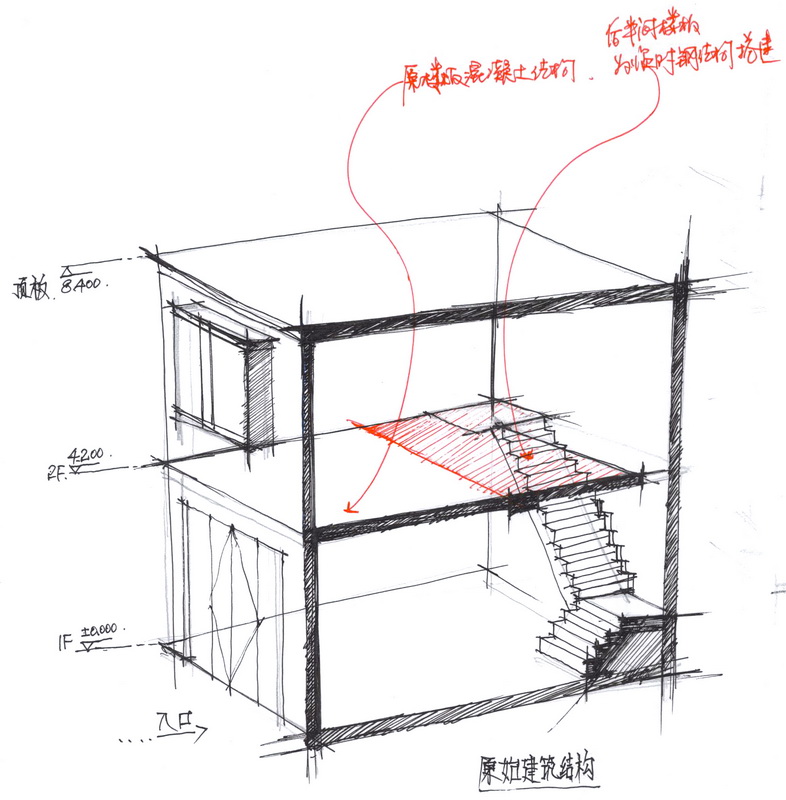 大厅保留原空间层高,在中间柱子的位置格出后面房间,后面和二层做两层夹层,原4.2米层高,预计做完地面和结构后介于2100~2050mm之间,